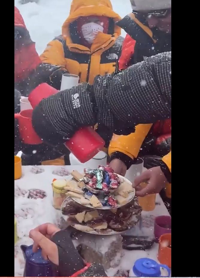 സ്റ്റ് ക്യാമ്ബ് 2ല് നടന്ന ലോകത്തിലെ ഏറ്റവും ഉയരം കൂടിയ ചായസല്ക്കാരം’ എന്ന അടിക്കുറിപ്പോടെയാണ് വിഡിയോ പുറത്തുവെച്ചത്. സിയാറ്റില് സ്വദേശികളായ ആന്ഡ്രൂ ഹ്യൂസും അദ്ദേഹത്തിന്റെ ക്ലൈബിങ് സംഘവുമാണ് സല്ക്കാരം സംഘടിപ്പിച്ചത്.